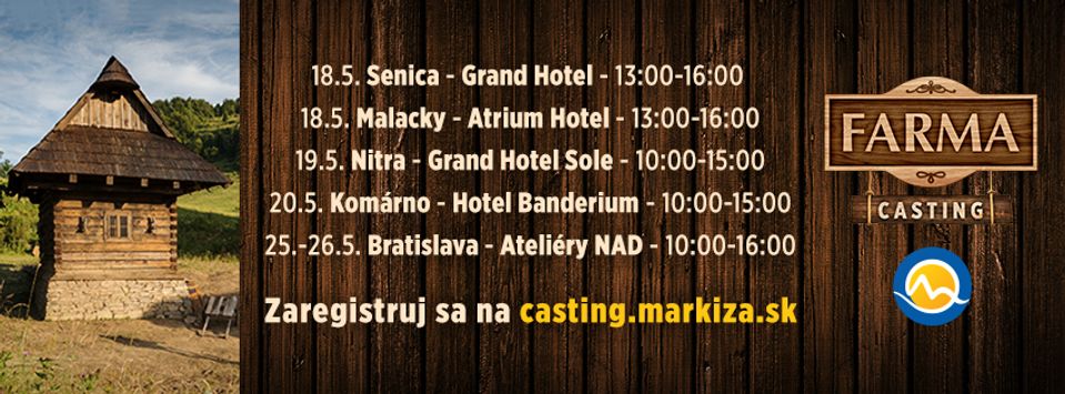 Kastingy do drsnej reality šou sú v plnom prúde, pred nami sú posledné dva víkendy, počas ktorých sa môžete ukázať a presvedčiť, že na Farmu patríte práve vy. Tešíme sa na vás v piatok v Senici a Malackách, v sobotu v Nitre a v nedeľu v Komárne.